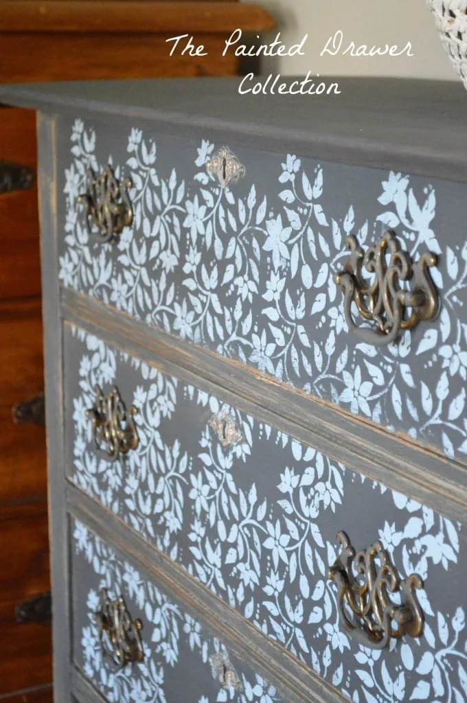 I decided to have fun. I first applied a coat of General Finishes Somerset Gold as a base color. I then applied a coat of Annie Sloan Graphite and decided to break out my stencils. I used Louis Blue with a pretty flower pattern. The very gold pulls were toned down with a touch of Graphite and the gold accents tied it all together. The whole piece was then heavily distressed to give it back its age and give it true farmhouse vibe. I love how the distressing really highlights the old paneled sides. The drawers were lined in blue striped paper and the whole piece was sealed with Artisan Enhancements clear topcoat sealer.