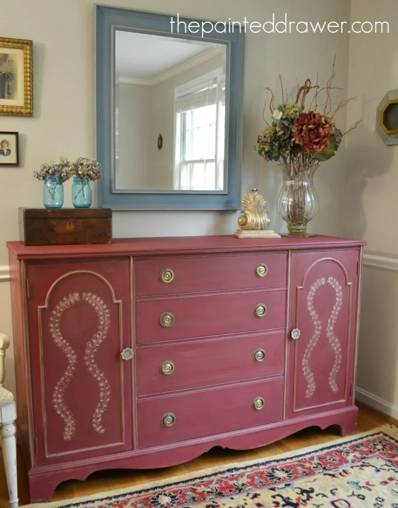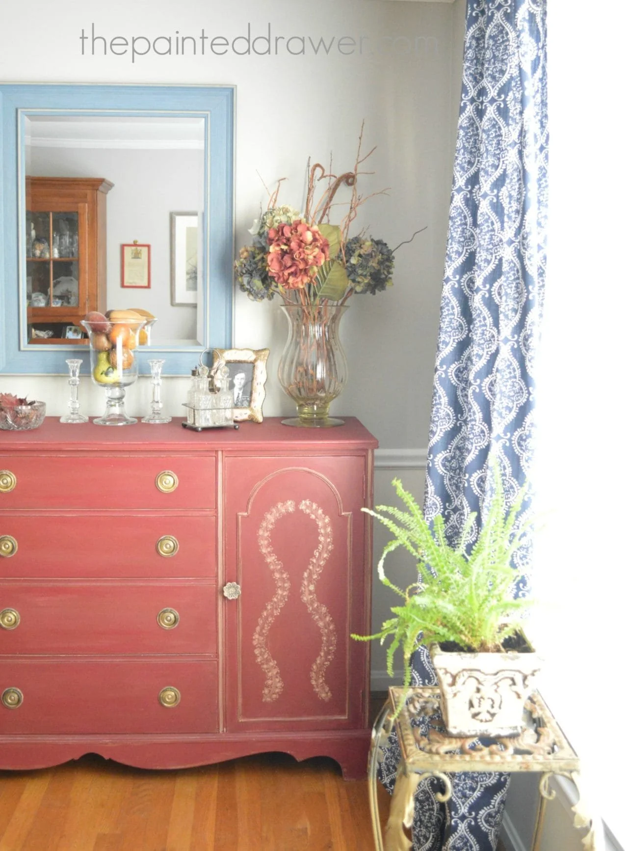 I was on my morning run last week and suddenly had the inspiration to paint my dining room buffet the deep reddish tone of the falling leaves. The red color tones in better with the warmth of my table and china cabinet. I ran home (literally) and jumped in the car to talk to Celeste over at Catfish Studios. She is my good friend and Annie Sloan stockist. We played around a little and decided to take Primer Red and add a tiny bit of Burgundy to create that lovely, warm, deep red. I also added a wash of burgundy on top of the mix as the first finish wasnβt quite deep enough without it.
